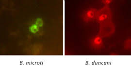 The FISH image, in black and white, enhances the visibility of Babesia microti and duncani.