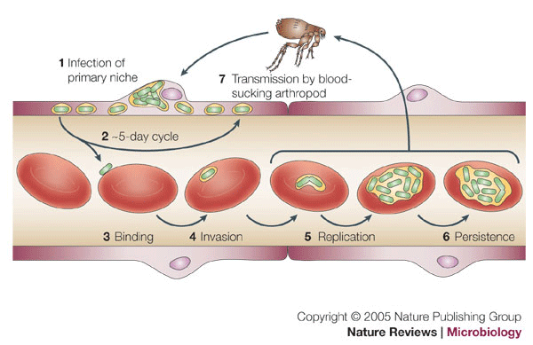 Bartonella invades red blood cells. It takes over them and causes them to rupture.