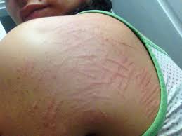 It does cause an unusual streaked rash that resembles stretch marks on the chest, abdomen, back, legs, and shoulders. They are not your typical stretch marks from weight gain/loss. Pictures clearly demonstrate the difference.